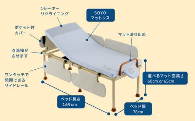 ベッド長さ169cm 1モーター電動リクライニング SOYOマットレス内蔵(強・弱2段階、タイマー6・9・12時間) ワンタッチ開閉サイドレール 2分割折りたたみ 非課税対応 | — | 99,800 (非課税) |