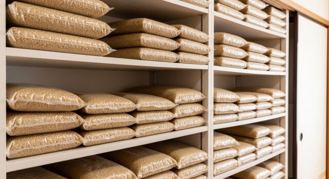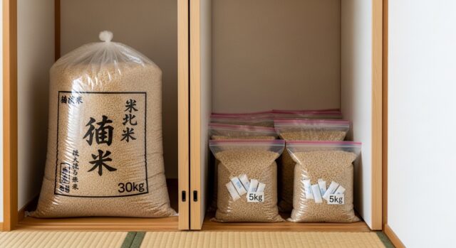 一人暮らしのマンションなので、収納スペースは限られています。私は押入れの下段を備蓄スペースにしています。30kg袋を1つと、残りは5kg×4袋に小分けして脱酸素剤と一緒にジップ付き袋へ。場所さえ確保すれば、一人暮らしでも50kgは十分保管できます。